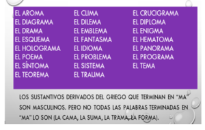 But unfortunately, we have exceptions. In the first place, only a small bunch of words like “el día, el planeta, el mapa, el sofá, el pijama” are masculine ending in -a. This is affected by the origin of the words. In the second place, we have a group of Greek words ending with -ma that are masculine, and some of them, like “el problema, el sistema, el programa, el clima, el tema”, are very common. Here they are. I don’t put all of them, because there are many technical terms that you will see, for example, in medical terminology. I will do a blog about this topic for advanced students, nurses and doctors.